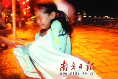海陵島上的小游客在狂風(fēng)中艱難行走。本報(bào)記者朱丹陽(yáng)梁文祥攝