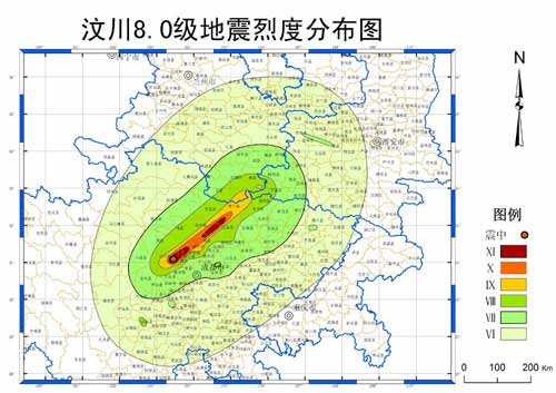Ⅺ度區(qū):面積約2419平方公里,以四川省汶川縣映秀鎮(zhèn)和北川縣縣城為兩個(gè)中心呈長(zhǎng)條狀分布,其中映秀Ⅺ度區(qū)沿汶川-都江堰-彭州方向分布,長(zhǎng)軸約66公里,短軸約20公里,北川Ⅺ度區(qū)沿安縣-北川-平武方向分布,長(zhǎng)軸約82公里,短軸約15公里。