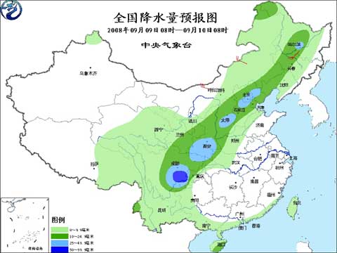 2008年9月9日8時-10日8時全國降水量預(yù)報圖