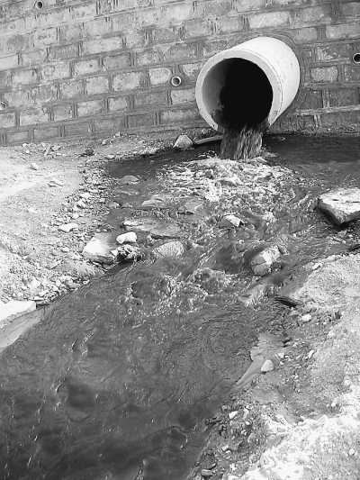記者溯水而上,發(fā)現(xiàn)正在建設(shè)的陜煤集團(tuán)神木檸條塔礦業(yè)有限公司,在龍泉村附近有一根直徑約80厘米的大塑料管伸向河道,管子里嘩嘩地流著一股有濃烈異味的黑水(見(jiàn)圖②),從正在打的礦井未經(jīng)處理就排到河道,與上游流下來(lái)的水匯合時(shí)有一條明顯的線,可謂涇渭分明。