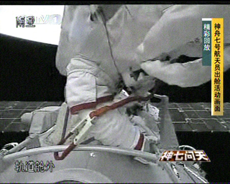 中新網(wǎng)9月27日電 中國“神七”載人飛船航天員翟志剛今天下午16時(shí)43分左右順利出艙,實(shí)施中國首次空間出艙活動(dòng)。他取下放置在軌道艙外壁上固體潤滑材料試驗(yàn)樣品,遞給艙里的航天員劉伯明。