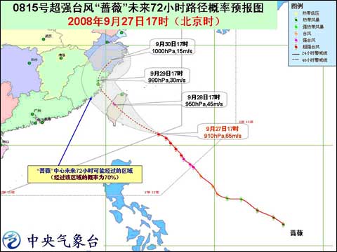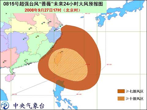 中新網(wǎng)9月27日電 據(jù)中國(guó)天氣網(wǎng)消息,中央氣象臺(tái)2008年9月27日18時(shí)發(fā)布臺(tái)風(fēng)紅色警報(bào)稱(chēng):預(yù)計(jì),今年第15號(hào)超強(qiáng)臺(tái)風(fēng)“薔薇”將以每小時(shí)20-25公里的速度向西北方向移動(dòng),逐漸向臺(tái)灣東部一帶沿?拷,將于明天中午到夜間在臺(tái)灣宜蘭到臺(tái)東一帶沿海登陸。