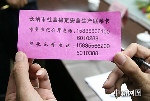 中新網(wǎng)長治10月21日電(記者 唐偉杰 任麗娜)9月底,山西長治市共印制了96萬張印有市委書記和市長電話的“名片”。這些“名片”日前陸續(xù)發(fā)放到全市1萬名公安干警、5萬名煤礦工人、10萬市民家庭、80萬農(nóng)民家庭。長治市民可直接撥打“名片”上的電話反映問題。