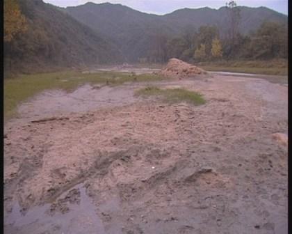 解說(shuō):記者來(lái)到現(xiàn)場(chǎng),果然看到一片因尾礦庫(kù)泄露的莊稼地.。上面覆蓋著厚厚的礦渣.就在記者正在拍攝時(shí),巨恒公司二廠的人員趕來(lái),阻止了記者的繼續(xù)拍攝。見此情況記者離開了巨恒公司二廠。沿河道向上繼續(xù)了解情況。