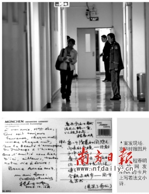 發(fā)言人的介紹,也證明了部分網(wǎng)友博客中的說法。網(wǎng)友“夜江湖”稱:“昨晚大家在各宿舍討論案情,一說到兇手的專業(yè)、籍貫,馬上就想到一個(gè)人:F某某。一查證,果然就是這個(gè)人,就住在我們樓下。在校內(nèi)網(wǎng)上,還能看到他的照片,長(zhǎng)得很斯文!