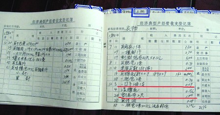 翻開劉元九1982年的賬本,在“衣物支出”一欄內(nèi)可以清楚地看到:11月4日給建英(劉元九妻子)買一雙布鞋,3元。12月20日割花布兩尺,1元。這一年,劉元九一家三口買衣服總共花了20.72元。