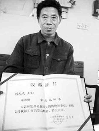 劉元九展示國(guó)家博物館頒發(fā)給他的收藏證書(shū)。