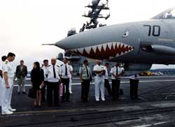 訪美期間,中國海軍官兵參觀美國航母。