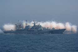 “和平使命-2005”中俄聯(lián)合演習在黃海舉行,我導彈驅逐艦發(fā)射干擾彈。