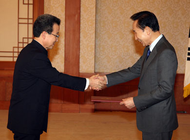 隨后程大使到接見(jiàn)廳向李明博總統(tǒng)遞交國(guó)書(shū)。韓外交部長(zhǎng)官柳明桓、總統(tǒng)外交安保首席秘書(shū)金星煥和中國(guó)駐韓國(guó)大使館公參邢海明、陳洲等參加了儀式。