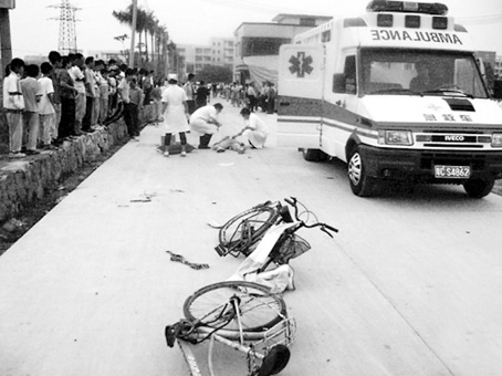 而此時,駱某正駕駛著泥頭車(當(dāng)?shù)乩恋囊环N貨車)經(jīng)城東歧江路開往城東中學(xué),在歧江路的拐彎處撞倒了3名學(xué)生和1名群眾。正在城東中學(xué)北門(后門)值班的綜治員黃積強和張耀毫發(fā)現(xiàn)后,一人邊大喊讓剛放學(xué)的學(xué)生們躲避,邊用對講機向白蕉鎮(zhèn)派出所報告,另一人則追趕泥頭車喝令其停下。
