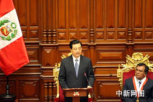 中國(guó)國(guó)家主席胡錦濤二十日在秘魯國(guó)會(huì)發(fā)表重要演講。中新社記者 齊彬攝