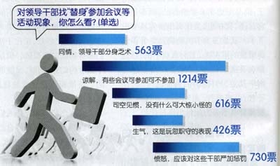 “你認(rèn)為領(lǐng)導(dǎo)干部找‘替身’開會對工作是否有影響?”問卷調(diào)查結(jié)果顯示,46.56%的受調(diào)查者認(rèn)為“有影響,規(guī)定‘一把手’參加的會議自有其道理”,24.34%的受調(diào)查者認(rèn)為“很難說,要看具體情況而定”,29.1%的受調(diào)查者認(rèn)為“沒有影響,只要將會議的主要精神傳達(dá)到了就可以”。