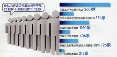 “你認(rèn)為應(yīng)該如何解決領(lǐng)導(dǎo)干部找‘替身’開會的問題?”問卷調(diào)查結(jié)果顯示,65.03%的受調(diào)查者認(rèn)為“盡量減少不必要的會議”,37.7%的受調(diào)查者認(rèn)為“會議的內(nèi)容要精簡,有的放矢”,23.56%的受調(diào)查者認(rèn)為“對找‘替身’開會的現(xiàn)象加大管理力度,對相關(guān)人員要進行懲罰”,18%的受調(diào)查者認(rèn)為“加大運用電視電話等創(chuàng)新會議形式”。由此可見,表示應(yīng)減少會議或精簡會議內(nèi)容的占到受調(diào)查者的88.59%。