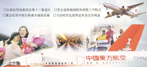 記者在采訪中了解到,我國目前沒有對行政征用進行專門的立法,行政征用除了有憲法的依據(jù)外,還散見于其他法律法規(guī)之中,如涉及消防、抗洪、抗震等。但針對征用機場、客機的具體規(guī)定,還是空白。