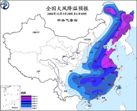2008年12月4日18時(shí)全國(guó)大風(fēng)降溫預(yù)報(bào)圖