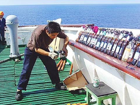 這時我們的船員都退到了生活區(qū),因為主甲板到駕駛樓下生活區(qū)有6米高的落差,兩者中間的兩架鐵梯已經(jīng)事先被割斷了,我們也將生活區(qū)的門封住了,海盜進(jìn)不來。我在駕駛樓里通知所有的船員說,一定不要暴露自己的身體,然后大家將艙里的幾百個啤酒瓶裝上了油漆水,點著了,拼命朝甲板上扔,海盜哇哇大叫。