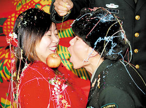 只見哨所營(yíng)房?jī)?nèi)外洋溢著一派喜慶的氣氛,戰(zhàn)友們列隊(duì)歡迎一對(duì)新人的到來(lái)。新建的保溫板房?jī)?nèi),大紅喜字貼滿了窗戶、墻壁。放鞭炮、迎新人、撒金紙、噴彩條、領(lǐng)導(dǎo)祝福、戰(zhàn)友祝賀、喝交杯酒、鬧新房……在中俄邊界259/4號(hào)界碑處,新人手拉著手,面對(duì)界碑許下誓言:“界碑見證我們的愛情!界碑不倒,愛情不變!”
