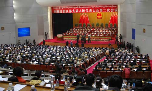 1月14日早上9點(diǎn)40分,西藏自治區(qū)九屆人大二次會(huì)議在拉薩隆重開幕。西藏自治區(qū)黨委副書記、自治區(qū)人大常委會(huì)主任列確主持會(huì)議。自治區(qū)黨委副書記、自治區(qū)主席向巴平措做《政府工作報(bào)告》。(韓連啟)