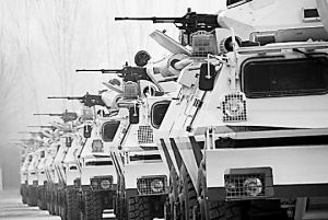 車隊(duì)啟動(dòng)了。一路上,沿途不斷傳來槍聲和爆炸聲,伊拉克警察和美軍車隊(duì)不時(shí)從身邊疾馳而過。席栓柱和戰(zhàn)友們?cè)谲噧?nèi)頭戴鋼盔、身穿防彈衣,手指頭一刻也不離開扳機(jī),眼睛全神貫注地搜索著窗外每一個(gè)可疑情況。