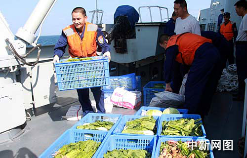 “?凇迸灩俦徇\(yùn)補(bǔ)給到艦上的新鮮蔬菜。 中新網(wǎng)記者 孫自法 攝