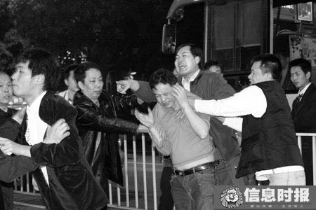 在現(xiàn)場(chǎng),記者看到該名穿淺紅色衣服的男子在不停打電話,該名男子身高大概1米65左右,情緒暴躁,揮舞手臂。在接受警方調(diào)查時(shí),該名男子忽然一拳將旁邊面包車(chē)司機(jī)的兒子陳家文打倒在地。隨后還推開(kāi)前來(lái)執(zhí)勤的交警!澳銈?nèi)?wèn)問(wèn),知不知道我是誰(shuí)?”該名男子向人群叫囂,現(xiàn)場(chǎng)一片混亂。 (信息時(shí)報(bào))
