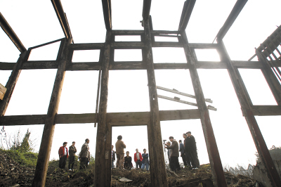 昨天上午,在劉伯承元帥的侄孫劉武青陪伴下,開縣近20名父老在舊居前緬懷劉帥。記者在現(xiàn)場看到,舊居左邊一間屋子的兩層樓全部被拆成光架架,幾根碗口粗的圓木和幾段斷壁殘?jiān)铝懔愕伛盗⒃诨慕贾小S疫叾䴓堑哪举|(zhì)窗戶早已殘缺不全,樓下具有巴渝民間建筑特色的雕花窗格,也遭到盜賊光顧,部分用竹篾條加石灰制作的墻面,在風(fēng)吹雨打中也早已斑駁脫落。