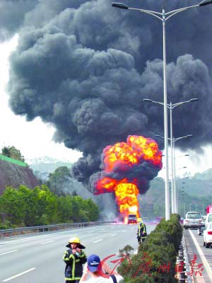 昨日下午4時20分,記者在莞深高速塘廈出入口看到,車龍排起有400米長,往東莞去的道路已經(jīng)封閉,記者步行4公里趕到事發(fā)現(xiàn)場。起火的油罐車在東莞往深圳方向的車道,熊熊燃燒的火苗躥到20米高,濃煙翻滾,人在200米外就能感覺到灼痛。