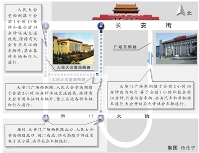 據(jù)介紹,在每次開會(huì)、散會(huì)前,天安門廣場西側(cè)路、人民大會(huì)堂南側(cè)路及人民大會(huì)堂西側(cè)路將分別采取交通管理措施,禁止各種車輛和行人通行。屆時(shí),天安門廣場西側(cè)路北口、人民大會(huì)堂西側(cè)路北口、前門西站、供電局路口將設(shè)置電子顯示屏,誘導(dǎo)社會(huì)車輛繞行。
