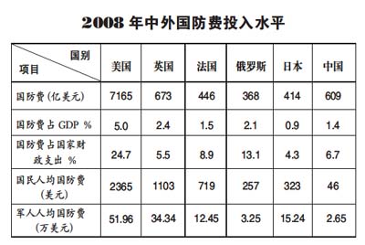 首先,應(yīng)當(dāng)看到中國(guó)國(guó)防費(fèi)的投入是適度有限的。近年來(lái),中國(guó)的國(guó)防費(fèi)有了較大幅度的增長(zhǎng),似乎中國(guó)的國(guó)防費(fèi)已經(jīng)很多了,但如果以歷史的、聯(lián)系的,而不是以孤立的、片面的觀點(diǎn),來(lái)審視和分析中國(guó)的國(guó)防費(fèi)問(wèn)題,就會(huì)得出一個(gè)中國(guó)的國(guó)防費(fèi)投入實(shí)際上并不多的客觀結(jié)論。從歷史上看,中國(guó)國(guó)防費(fèi)投入的增長(zhǎng)帶有明顯的補(bǔ)償性。根據(jù)國(guó)家統(tǒng)計(jì)局有關(guān)公開(kāi)資料,從1979年到1989年,國(guó)防費(fèi)平均增長(zhǎng)為1.23%,與同期居民消費(fèi)價(jià)格總指數(shù)平均上漲7.49%相比,實(shí)際年平均負(fù)增長(zhǎng)超過(guò)6%。從1990年到1997年國(guó)防費(fèi)年均增長(zhǎng)15.8%,而同期居民消費(fèi)價(jià)格總指數(shù)平均上漲9.7%,中國(guó)國(guó)防費(fèi)排除物價(jià)因素后實(shí)際年均增長(zhǎng)只有6.1%。直到1998年國(guó)家物價(jià)指數(shù)比較平穩(wěn)之后,為降低長(zhǎng)期經(jīng)費(fèi)不足給國(guó)防和軍隊(duì)建設(shè)帶來(lái)的影響,國(guó)防費(fèi)投入才逐步有了較大幅度的實(shí)際增長(zhǎng)。在長(zhǎng)達(dá)10多年的“忍耐”過(guò)程中,中國(guó)國(guó)防和軍隊(duì)建設(shè)因經(jīng)費(fèi)不足而受到很大影響。從中國(guó)自身的情況看,中國(guó)國(guó)防費(fèi)的支出也是極其有限的。以這次兩會(huì)公布的有關(guān)數(shù)字為例,2009年中國(guó)國(guó)防費(fèi)預(yù)算比上一年度執(zhí)行數(shù)增加了14.9%,占全國(guó)財(cái)政支出預(yù)算的6.3%,與前幾年相比,所占比重略有下降,而同期教育費(fèi)增長(zhǎng)22.5%、醫(yī)療衛(wèi)生費(fèi)增長(zhǎng)20.9%、社會(huì)保障和就業(yè)費(fèi)增長(zhǎng)23.1%、環(huán)境保護(hù)費(fèi)增長(zhǎng)22.3%、保障性安居工程經(jīng)費(fèi)增長(zhǎng)199.6%,可見(jiàn)國(guó)防費(fèi)的增長(zhǎng)在各項(xiàng)社會(huì)事業(yè)費(fèi)的增長(zhǎng)中是相對(duì)偏低的,中國(guó)始終堅(jiān)持把主要的財(cái)力用于改善民生。再?gòu)膰?guó)際上看,中國(guó)與美、英、法、俄、日等國(guó)家相比,無(wú)論是國(guó)防費(fèi)占國(guó)家國(guó)內(nèi)生產(chǎn)總值(GDP)的比重還是占國(guó)家財(cái)政支出的比重,無(wú)論是國(guó)民人均國(guó)防費(fèi)還是軍人人均國(guó)防費(fèi)投入等主要指標(biāo)都是比較低的(如右表所示)。