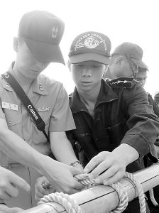 這是一個海軍基礎(chǔ)課目。海曹抓住纜繩后,用力將撇纜頭拋向預(yù)定區(qū)域。演示完畢,教員要求每個參訓(xùn)人員都做一遍。