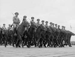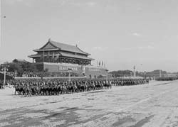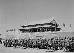 阿木古楞:受閱壓力很大,覺得在天安門接受毛主席檢閱,比打錦州沖鋒陷陣還緊張啊。記得閱兵總指揮楊成武在會上對各部隊指揮員說,誰的馬驚了,就撤團長的職。我們真擔(dān)心出岔子啊。部隊訓(xùn)練很刻苦,士兵很下功夫。在北京駐訓(xùn)時正是炎夏,北京熱呀。我們騎兵常年駐在草原,涼快慣了,熱得人和馬都受不了。我們每天早上4時起床,5時就開始訓(xùn)練,練到10時才休息,下午接著練,一直練到黃昏。特別是馬不好練。我們的馬都是從戰(zhàn)場上下來的,打仗可以,騎手雙腿一夾,馬撒腿就往上沖,現(xiàn)在不行,必須步伐整齊。要踩著音樂,跟上拍子。