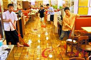 短時(shí)間的強(qiáng)降雨導(dǎo)致沙河金馬服裝城一樓檔主遭殃,數(shù)十家檔口被淹。檔主李小姐說:“衣服全部濕了,損失幾萬(wàn)元呢!弊尷钚〗悴粷M的是,平常一樓鋪?zhàn)饩秃苜F,每個(gè)月至少5000元,但水浸后,管理人員卻沒有馬上處理。