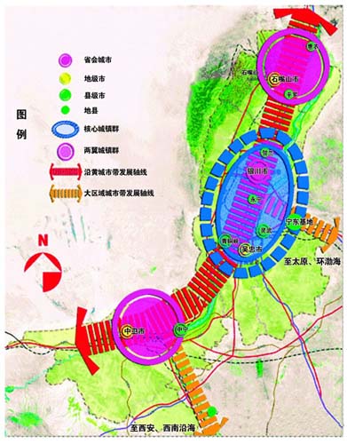 近年來,寧夏回族自治區(qū)黨委、政府確定了向黃河靠攏的發(fā)展思路,大力實(shí)施中心城市帶動(dòng)戰(zhàn)略。2008年,寧夏進(jìn)入了城市化加速發(fā)展時(shí)期,全區(qū)城市化率達(dá)到45.5%,人均GDP超過2000美元,對(duì)經(jīng)濟(jì)社會(huì)發(fā)展的推動(dòng)作用日益凸顯。目前,寧夏沿黃河分布的銀川、石嘴山、吳忠、中衛(wèi)、平羅、青銅峽、靈武、賀蘭、永寧、中寧10個(gè)城市以43%的國(guó)土面積,集中了寧夏全區(qū)57%的人口、80%的城鎮(zhèn)、90%的城鎮(zhèn)人口,創(chuàng)造了寧夏90%以上的GDP和財(cái)政收入,已初具城市帶雛形。今后,寧夏將全面推進(jìn)這一地帶的城市化進(jìn)程,著力打造生命保障線、搶險(xiǎn)交通線、經(jīng)濟(jì)命脈線、特色城市線、生態(tài)景觀線和文化展示線。加快公交互通、金融同城、電訊同區(qū)、電力同網(wǎng)、信息共享步伐,形成以首府銀川市為中心的“一小時(shí)經(jīng)濟(jì)圈”,以石嘴山市、中衛(wèi)市、吳忠市三個(gè)沿黃地級(jí)市為次中心的“半小時(shí)通勤圈”,促進(jìn)中部干旱地區(qū)和南部山區(qū)10個(gè)縣(區(qū))的人口向沿黃地區(qū)聚攏。