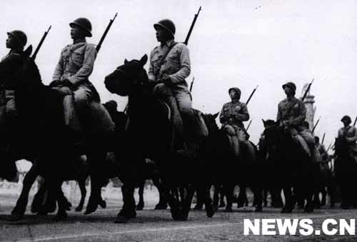 毛主席宣讀公告完畢,閱兵式開始。閱兵式由人民解放軍朱德總司令任檢閱司令員,華北軍區(qū)司令員兼京津衛(wèi)戍區(qū)司令員聶榮臻將軍任閱兵總指揮。朱總司令驅(qū)車檢閱各兵種部隊,回到主席臺上宣讀人民解放軍總部命令。受閱部隊隨即分列經(jīng)主席臺前由東向西行進(jìn),前后歷時三小時。受閱部隊以海軍兩個排為前導(dǎo),接著是一個步兵師、一個炮兵師、一個戰(zhàn)車師、一個騎兵師,相繼跟進(jìn)?哲姲☉(zhàn)斗機(jī)、運輸機(jī)、教練機(jī)共十四架在全場上空自東向西飛行受閱。在閱兵式中,全場掌聲象波浪一樣,一個高潮接著一個高潮。