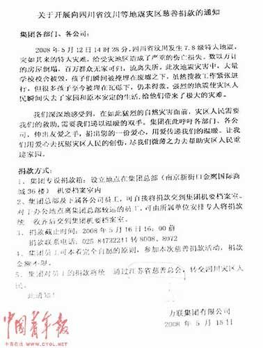 中國青年報記者多次采訪了其中的一名員工劉燕寧。劉燕寧告訴記者她就是捐款的經辦人。2008年5月15日,汶川特大地震發(fā)生后,經請示力聯(lián)集團負責人翟韶均,力聯(lián)集團發(fā)出了《關于開展向四川省汶川等地震災區(qū)慈善捐款的通知》,號召廣大員工向災區(qū)捐款。這一倡議得到了廣大員工的響應和支持,很快,捐款源源而來。在指定的捐款截止日期——5月16日16:00前,公司募集到了地震捐款41423.1元。