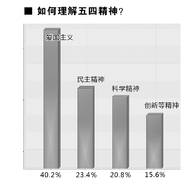 在對于五四精神的理解上,40.2%的受訪者選擇了“愛國主義”,認(rèn)為這是五四精神中首先需要傳承的精神遺產(chǎn),23.4%選擇“民主精神”,20.8%選擇“科學(xué)精神”,15.6%選擇“創(chuàng)新等其他精神”。調(diào)查顯示,國家、民族在大學(xué)生心中占據(jù)神圣的地位,75.4%的受訪者表示自己“為作為中國公民感到自豪”。