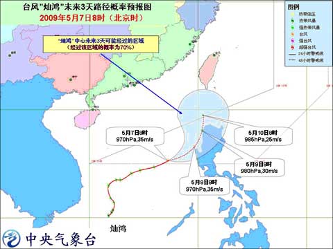 中新網(wǎng)5月7日電 中央氣象臺(tái)2009年5月7日10時(shí)發(fā)布熱帶氣旋公報(bào):今年第2號(hào)強(qiáng)熱帶風(fēng)暴“燦鴻”于今天上午加強(qiáng)為臺(tái)風(fēng),上午8時(shí)其中心位于東沙群島以南大約590公里的南海中部海面上,就是北緯15.3度,東經(jīng)117.3度,中心附近最大風(fēng)力有12級(jí)(35米/秒)。