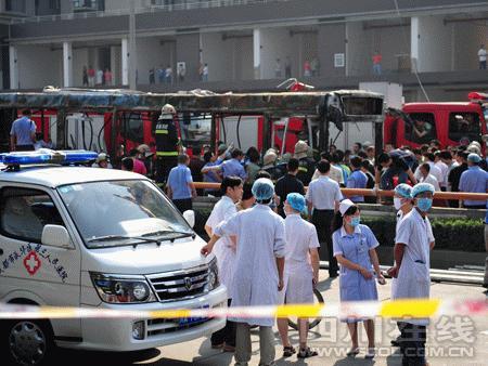 據(jù)中央電視臺(tái)記者介紹,目前,事故公交車已被拖走。記者在現(xiàn)場看到,事故公交車被燒的嚴(yán)重變形,座位全部被燒焦了。事故路段近300米已戒嚴(yán),地上有近30米長的帶血的腳印。目前現(xiàn)場有群眾圍觀。