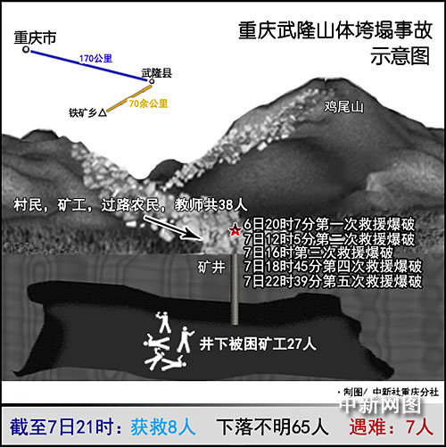 5日下午3時發(fā)生的重慶市武隆縣鐵礦鄉(xiāng)雞尾山山體垮塌災害,直接導致山對面的三聯(lián)采礦場和幾所民居及一些路人被埋。經(jīng)過兩天兩夜的搜救工作,截至7日23時,救援人員已發(fā)現(xiàn)7位遇難者遺體。包括此前救出的8名傷者和證實2名失蹤者當時不在事故現(xiàn)場外,尚有65人下落不明,其中,被埋井下有礦工27人。
