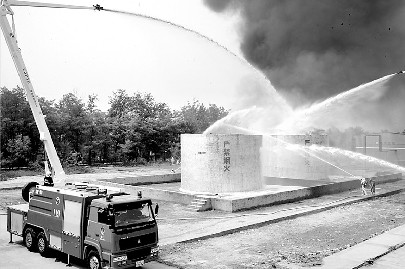 15時15分,就在圍剿接近尾聲時,現場突然出現意外,一名殘余“恐怖分子”引燃身上所攜帶炸藥,將廠區(qū)內兩個化工原料儲存罐炸毀,造成大量有毒化學氣體泄漏。廠區(qū)內頓時濃煙滾滾,火光沖天。面對緊急情況,消防力量馬上出擊,展開滅火、化學品罐堵漏、毒氣源稀釋等工作。同時環(huán)保、氣象和衛(wèi)生力量也馬上進行空氣監(jiān)測、中毒人員緊急救治等工作。大約半小時后,人質和中毒人員全部得到緊急救治,廠區(qū)周圍有毒氣體濃度也降到安全值以內,周邊地區(qū)和首都北京的安全得到了保障。演習結束。