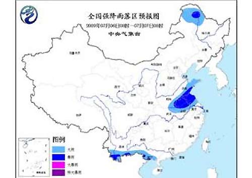 中新網(wǎng)7月6日電 中央氣象臺6日06時發(fā)布暴雨預(yù)報:預(yù)計今天白天到夜間,內(nèi)蒙古東北部、黑龍江西北部、山東南部和東部、河南南部、蘇皖中北部、云南南部、廣西南部等地的部分地區(qū)有大雨。