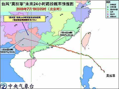 今年第6號臺風“莫拉菲”(MOLAVE)的中心已于19日凌晨0時50分在廣東省深圳市大鵬半島沿海登陸,登陸時中心附近最大風力有13級(38米/秒),中心最低氣壓965百帕。登陸后,“莫拉菲”強度逐漸減弱,19日凌晨4時在深圳市境內減弱為強熱帶風暴,19日早晨5時,強風暴中心位于珠江口北部,就是北緯22.7度、東經113.7度,中心附近最大風力有10級(28米/秒)。