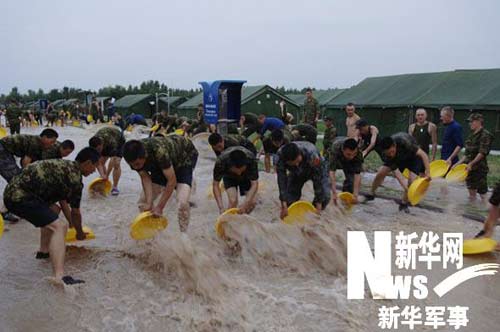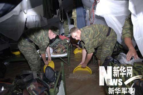 7月19日17時(shí)45分,中俄聯(lián)合軍演野營村突遭強(qiáng)風(fēng)暴雨襲擊,降水量達(dá)47毫米,最大風(fēng)力9級, 15分鐘路面積水即達(dá)10厘米,最深處達(dá)25厘米,中俄參演部隊(duì)多頂帳篷進(jìn)水。野營村緊急啟動(dòng)應(yīng)急預(yù)案,組織中俄兩軍參演官兵共同排水。當(dāng)晚20時(shí),經(jīng)中俄雙方官兵全力奮戰(zhàn),營區(qū)和帳篷大面積積水排除,被水淋濕的被服被更換(郭良生)