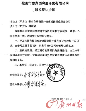 這名網友提供了部分圖片證據(jù),從圖上能看到,在2007年12月21日簽署的鞍山碧湖園房屋開發(fā)有限公司股權轉讓協(xié)議上,出讓方簽名付維強,受讓方簽名為傅維強。網帖還貼出當?shù)嘏沙鏊_具的證明,證實付維強在2006年2月21日改名為傅維強。