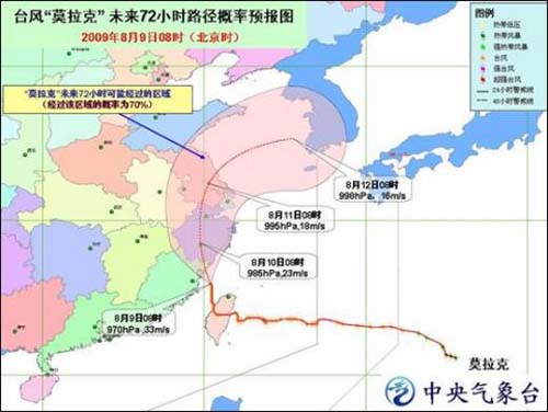 預(yù)計,“ 莫拉克 ” 將以每小時10公里左右的速度向北偏西方向移動,并將于今天下午到夜間在福建連江到浙江樂清一帶沿海登陸。