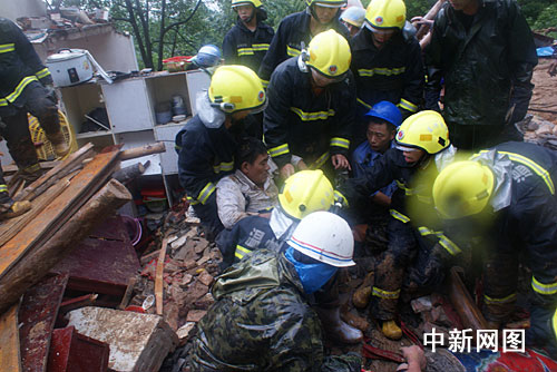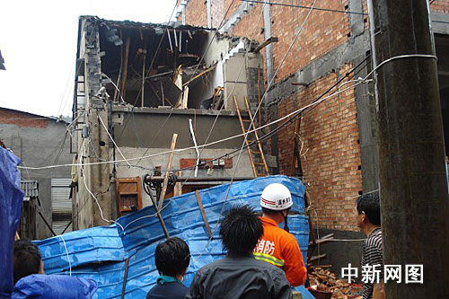 該房屋的二樓坍塌最為嚴重,房頂?shù)耐咂舅,瓦片、磚塊,泥石、水泥板堆滿了整個屋子,還有部分未完全倒塌的磚塊、梁柱仍在搖搖欲墜,現(xiàn)場一片混亂雜章。當時,正下著大暴雨,極有可能發(fā)生二次坍塌。為了控制險情,消防官兵架起梯子,爬上屋頂,迅速拆除另一半未坍塌的屋頂瓦片。