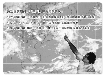 歷次國慶期間,北京曾經(jīng)出現(xiàn)過幾次大雨和連續(xù)性降雨:1976年9月30日—10月2日,北京連續(xù)降雨3天,過程降雨量達(dá)40.5毫米;1959年、1979年和1996年也出現(xiàn)過連續(xù)3天降雨的情況;1999年國慶50周年前夜,北京出現(xiàn)降雨,一直持續(xù)到10月1日早晨。9月30日16時(shí)到10月1日5時(shí),天安門地區(qū)的降水量為31毫米,給國慶活動的前期準(zhǔn)備工作造成了影響。