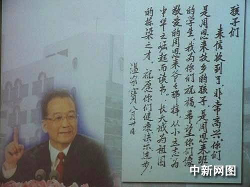時(shí)隔兩個(gè)多月,讓孩子們激動(dòng)萬(wàn)分的是居然盼到了溫總理的親筆回信。溫總理在回信中說(shuō):“你們是周恩來(lái)故鄉(xiāng)的孩子,是‘周恩來(lái)班’的學(xué)生,我為你們祝福。希望你們像敬愛(ài)的周恩來(lái)爺爺那樣從小立志‘為中華之崛起而讀書(shū)’,長(zhǎng)大成為祖國(guó)的棟梁之才。”