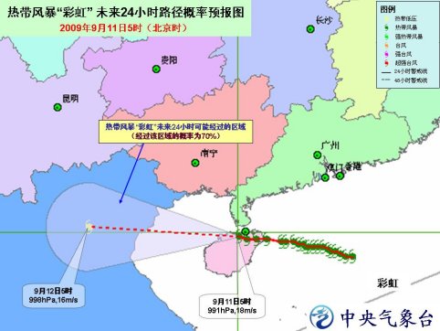 中新網(wǎng)9月11日電 中央氣象臺(tái)今日6時(shí)發(fā)布臺(tái)風(fēng)預(yù)報(bào):今年第13號(hào)熱帶風(fēng)暴“彩虹”今日凌晨已經(jīng)在海南登陸,預(yù)計(jì)風(fēng)暴中心將以每小時(shí)30公里左右的速度繼續(xù)向西偏北方向移動(dòng),橫穿海南北部地區(qū),將于今天上午進(jìn)入北部灣東部海面,并可能于今天晚上在越南北部沿海再次登陸。